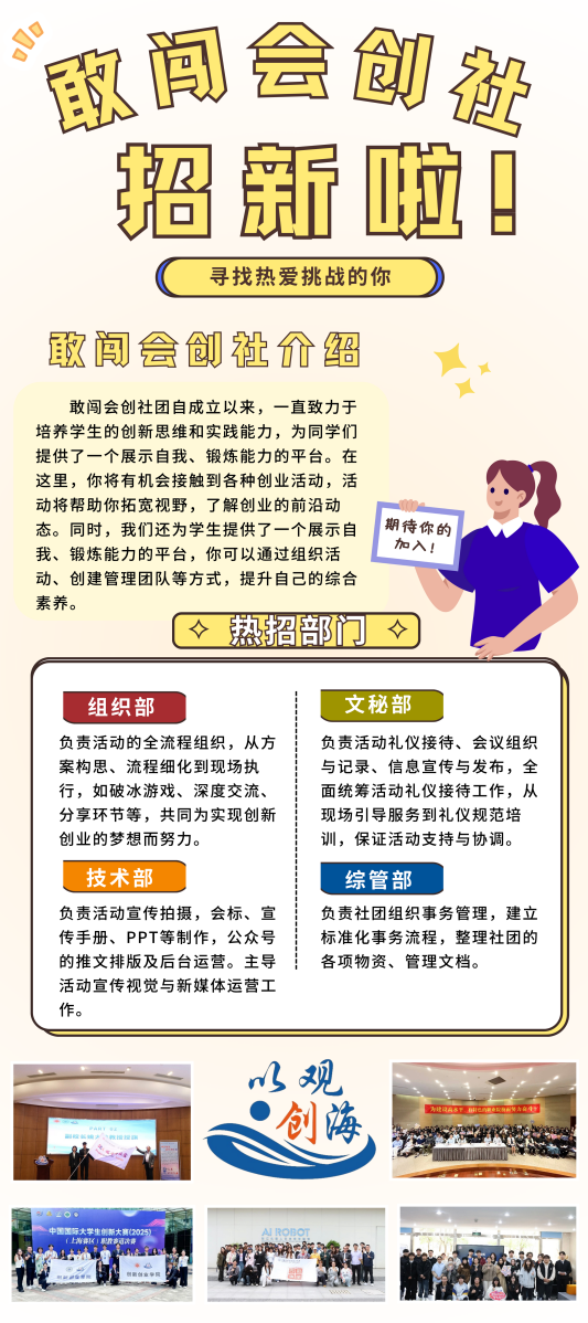 敢闯会创社自2023年创社以来,已经承接校级、区级、市级创新创业活动30余场,致力于锻炼学生的创新思维和组织管理能力。后续还将开展校外调研活动,为学生搭建从创意到实践的完整成长平台。