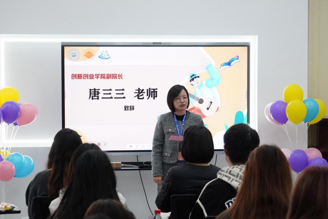 首先由双创学院副院长唐三三老师致辞。唐老师阐释了“敢闯”与“会创”的核心内涵,并寄语新一届成员传承社团优良传统,勇于突破、注重实践,积极参与创新创业相关项目与赛事,携手谱写社团发展新篇章。