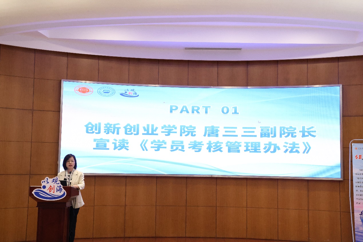 开营仪式现场,创新创业学院副院长唐三三宣读了《观海创业训练营学员考核管理办法》,她从学习管理制度、考勤和请假管理制度、班委会管理条例、优秀学员选拔规则四个方面对本次训练营学习过程和结业要求做了详细的说明。本次创业训练营构建形成"过程性考核+成果导向评价"的双维管理体系,通过专家理论授课、商业计划书迭代升级、项目路演等实践环节量化考核,确保"训赛结合、学用贯通"的教育理念落到实处。