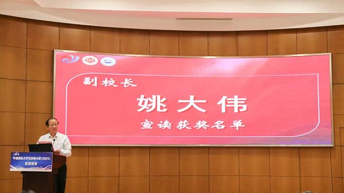 姚大伟副校长宣读获奖名单。现场气氛热烈,掌声雷动。获奖团队代表依次上台领奖,与会领导为他们颁发荣誉证书,并与他们合影留念,共同记录这一荣耀时刻。