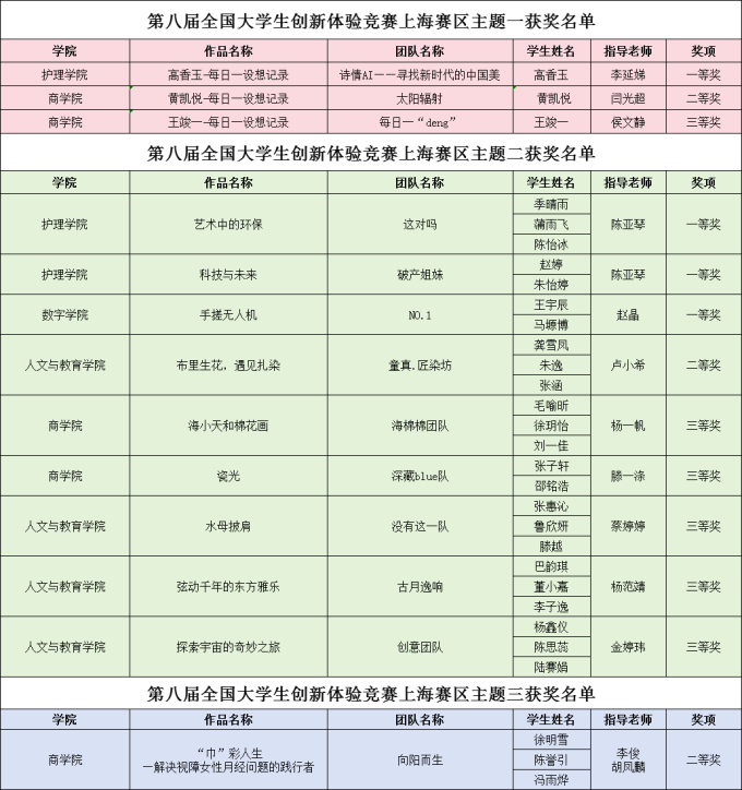 主题二:护理学院季晴雨、蒲雨飞、陈怡冰《艺术中的环保》(指导教师陈亚琴),赵婷、朱怡婷《科技与未来》(指导教师陈亚琴),数字学院王宇辰、马塬博《手搓无人机》(指导教师赵晶)分别获一等奖;人文与教育学院龚雪凤、朱逸、张涵《布里生花,遇见扎染》(指导教师卢小希)获二等奖;商学院毛喻昕、徐玥怡、刘一佳《海小天和棉花画》(指导教师杨一帆),张子轩、邵铭浩《瓷光》(指导教师滕一涤),人文与教育学院张惠沁、鲁欣妍、滕越《水母披肩》(指导教师蔡婷婷),巴韵琪、董小嘉、李子逸《弦动千年的东方雅乐》(指导教师杨范靖),杨鑫仪、陈思蕊、陆赛娟《探索宇宙的奇妙之旅》(指导教师金婷玮)分别获三等奖。